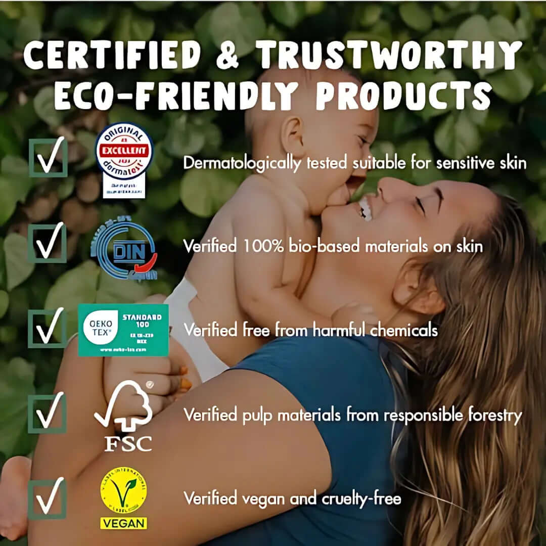 Our diapers are independently tested and certified by Dermatest®, FSC®, and ECOCERT®.